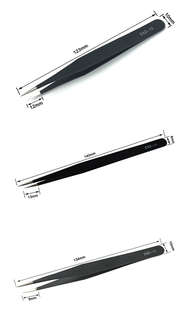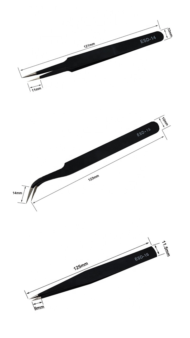 Oggi raccomandiamo in particolare una serie di pinzette anti-statiche, che sono realizzate in acciaio inossidabile di alta qualità e hanno resistenza agli acidi, non magnetica, resistenza alla corrosione chimica, resistenza al calore e altre caratteristiche. Sono ideali per operazioni di precisione nel settore dell'elettronica: